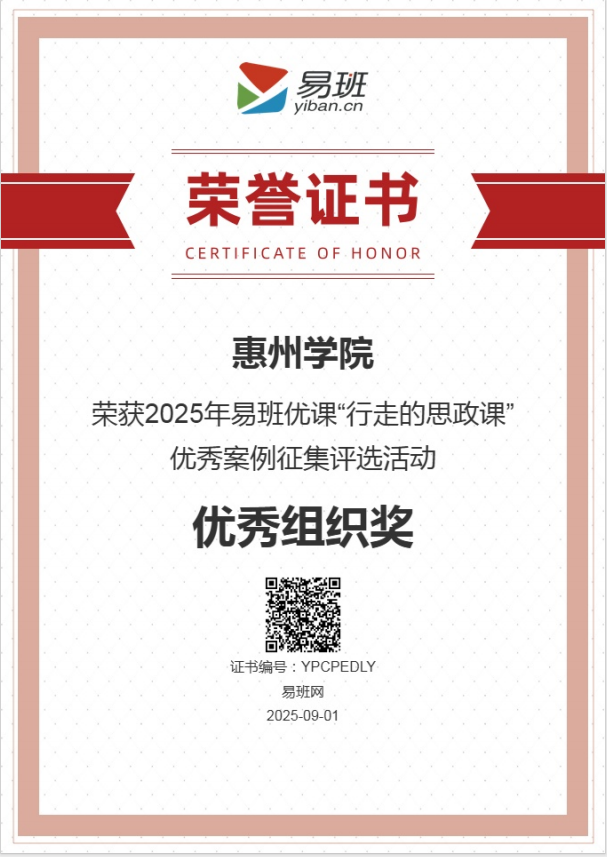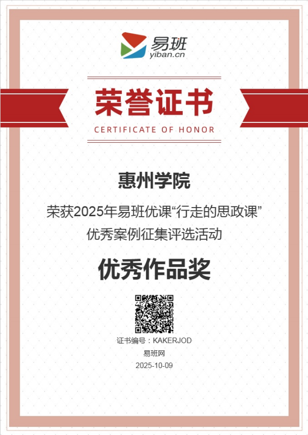 本网讯 近日,2025年全国易班优课“行走的思政课”优秀案例征集评选活动结果公布,我校美术与设计学院报送的《惠州学院“行走的思政课”——“重温历史-体验生活-参与生产”罗浮山下的思政育人实践活动》脱颖而出,成功入选,我校同时获得该活动“优秀组织奖”。