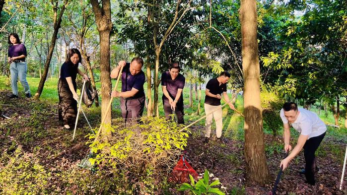 在办公区域,各科室员工分工明确、协作高效,对桌面文件、办公用品分类收纳,实现“物归其位、目视整洁”;并对地面清扫、门窗擦拭及角落除尘,彻底清除卫生死角。而在牌坊后山区域,刘国栋与部门负责人率先拿起工具,带领员工清扫落叶、拔除杂草、清运积存垃圾,重点清理了易孳生病媒生物的低洼积水处。尽管烈日当空,全员汗水浸透衣衫,但始终保持高涨热情,以实际行动践行“不怕苦、不怕累” 的爱国卫生运动精神。