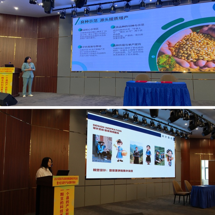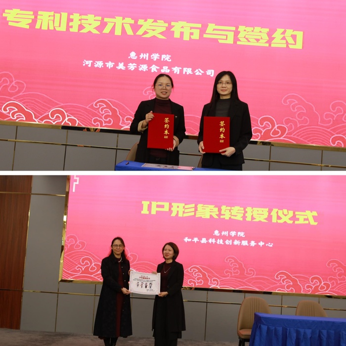 在成果发布环节,我校科学技术部副部长李冰雁对县域创新基地团队工作作了三大总结:第一,“把论文写在大豆田里,让产量‘立’起来”:通过“品种改良+智能生产+非遗IP”系统创新,和平县腐竹产业标准化生产率从20%提升至80%,出口单价增长40%,年销售额突破8000万元。该模式已入选省“百千万工程”专班简报,成为全省县域产业创新示范案例。第二,“把专利烙在腐竹机上,让产业‘强’起来”:涵盖“低温缓凝揭皮”“复合酶解减损”等核心工艺的5项国家发明专利,现场与河源市美芳源食品有限公司完成“零门槛”转化签约,真正实现“知产”变“资产”,助力高校成为企业身边的“研发部”。第三,“把IP种在消费者心里,让品牌‘响’起来”:由我校师生原创设计的区域公共品牌IP形象——“和平腐竹娘”正式发布。其系列LOGO、包装与表情包同步亮相,为传统腐竹注入年轻化魅力。团队下一步将启动“腐竹娘乡村小课堂”,推动品牌故事走进校园播下产业未来的种子。