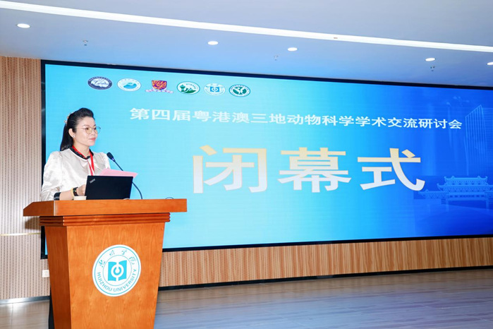 闭幕式上,广东省动物学会秘书长刘曦庆对我校组织本次会议工作表示肯定和感谢,并为表现优秀的研究生报告颁发了证书。她指出,此次研讨会不仅是一次高水平的学术交流活动,更为粤港澳三地的动物科技工作者搭建了友谊与合作的平台,有效促进了各方互动,成为协同发展的重要催化剂,充分彰显了三地同仁携手前行、互利共赢的坚定信念。她强调,应以此次研讨会为契机,不断拓展交流渠道,汇聚集体智慧,加强多边合作。她呼吁与会各方继续保持密切沟通,深化务实合作,共同为推动粤港澳大湾区动物科学事业的创新与进步贡献力量,为建设具有国际影响力的湾区和世界级城市群注入强劲动力。