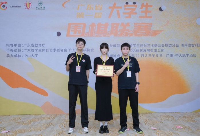 本网讯 11月8日至9日,首届广东省大学生围棋联赛在中山大学拉开帷幕。来自我校服装学院赵梓彤、数学与统计学院郭子昂、政法学院周扬迪三位同学组成代表队出战,凭借沉稳的发挥与出色的棋艺,在激烈角逐中展现了我校学子良好的精神风貌,助力学校荣获“优秀组织单位”称号。