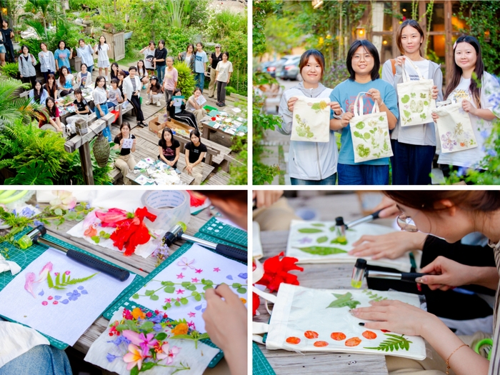 课程后半段转向艺术实践。国画教师蒙一宗现场示范花卉白描技法,引导学生“从整体到细节”观察植物形态。随后,服装学院文嘉婷博士指导学生体验“植物拓染”,通过选叶、铺布、敲打等步骤,将叶片的脉络与色素永久定格于布料之上。她指出:“这不仅是一门手艺,更是对植物结构与色素分布的感性认知与艺术再现。”