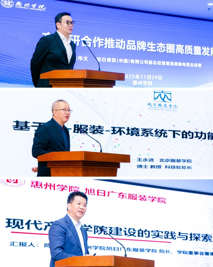 在主题演讲环节,刘伟文先生、王永进教授和旭日广东服装学院院长陈学军教授分别从产学研合作实践、功能户外服装研发、现代产业学院探索等维度分享了前沿观点。