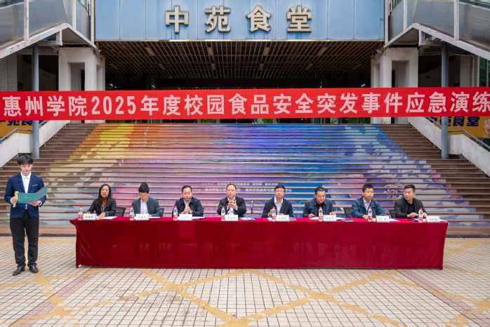 本网讯 11月30日上午,惠州学院2025年(Ⅳ级)食品安全突发事件应急演练在中苑食堂广场顺利开展。惠州市及惠城区市场监督管理局、惠城区卫生健康局、惠州华康医院等领导与专家出席演练。校党政办公室、宣传统战部、学生工作部、总务后勤部、保卫部、现代教育技术中心、团委、地理与旅游学院、政法学院等单位负责人到场观摩。