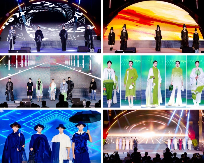 在成果展演环节,一场融合传统与现代、科技与艺术的时装大秀,生动呈现了服装学院“产教融合、教学相长”的完整育人链。从学生新锐创作、教师匠心传承到校友行业反哺,三代“惠院服装人”同台展示,构成“培养—成长—引领”的育人闭环。学生作品《无限回响》《绮梦逸动》等系列,将传统纹样与现代剪裁相融合,注入智能面料与可持续理念,展现出扎实的专业功底与活跃的创新思维。教师作品中,黄刚的《文脉承续》系列融汇非遗技艺与现代设计,黄寒的《意境》探索智能织造跨界可能,于芳的《上游・下游》诠释教学相长理念,充分彰显学院在文化传承与科研创新方面的深厚实力。值得一提的是,杰出校友、KEILAM高级定制创始人童晓妍携婚嫁系列《锦时・囍梦》与高定系列《星芒・绮境》重返母校,由校友模特段潇洁、石青青倾情演绎,展现出惠院服装人在时尚领域的卓越影响力,印证了人才培养的扎实成效与持续活力。