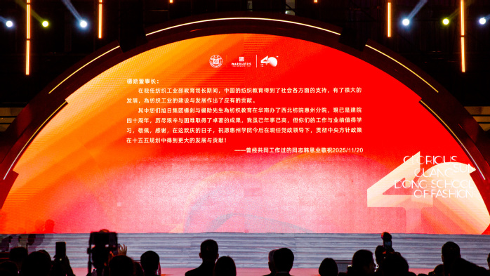 活动现场宣读了原纺织工业部教育司司长韩恩业发来的贺信。他在信中回顾了中国纺织教育的发展历程,高度评价旭日集团创办学院的远见卓识,充分肯定学院四十年来的办学成果,并对未来寄予美好祝愿。