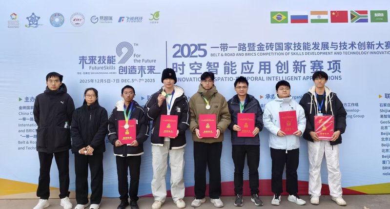 本网讯 近日,2025“一带一路”暨金砖国家技能发展与技术创新大赛“时空智能应用创新”赛项决赛在石家庄铁路职业技术学院落下帷幕。我校选派的两支参赛队伍从全国众多强队中脱颖而出,成功斩获佳绩——张培欣、郑智泓、刘飞、叶嘉琪团队荣获三等奖,陈启华、谢政权、钟玮欣、张树彬团队获评优秀奖,充分展现了我校学子扎实的专业素养与良好的竞技风貌。