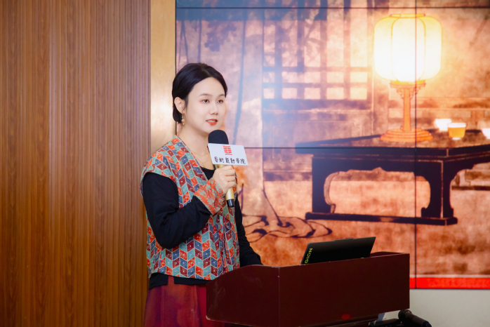 活动上,岳欧璐以唐代画家周昉的《调琴啜茗图》为切入点,生动还原了中唐时期三位女性调琴、备茶、听曲的悠闲生活场景。她深入解读画中暗藏的“唐代时尚密码”:以“曲眉丰颊,体态丰盈”为核心的审美标准,彰显了唐代包容开放的时代气质;胸线以上的裙头设计、宽袖长裙与披帛的经典搭配,既拉长身形比例、尽显雍容华贵,更蕴含着包容性剪裁的千年智慧。岳欧璐指出,周昉笔下“高古游丝描”与“铁线描”的刚柔并济,恰如其分呼应了唐代服饰丝绸之柔与轮廓之刚的完美融合,而服饰中暗藏的动态美学,更为现代设计提供了重要启示——服装应始终服务于人的姿态与活动,实现实用与审美的统一。