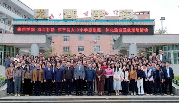 马克思主义学院党委书记陈雄辉、副院长罗泽荣,和平县教育局副局长黄志奋,惠州市教育科学研究院政治教研员曾鹏辉,以及来自惠州一中、惠州实验中学附属学校、仲恺高级中学附属学校、博罗县第三小学等学校的思政名师组成的项目组专家团队,和平县各学校思政工作分管领导及中小学道德与法治教师等共140余人参加此次活动。