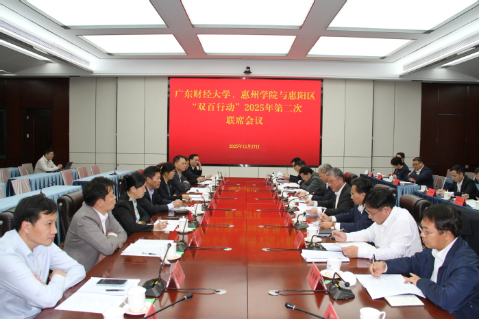 本网讯 12月17日,广东财经大学、惠州学院、惠阳区“双百行动”2025年第二次联席会议召开,系统总结一年来结对共建成果,并就下一阶段深化合作进行交流探讨。广东财经大学党委副书记刘祖华,惠州学院副校长魏晓慧,惠阳区委副书记、区长何国斌,惠州市委教育工委委员、市人民政府教育督导室主任督学、市教育局党组副书记孙伟存,区委常委、常务副区长欧阳惠鼎等参加会议。