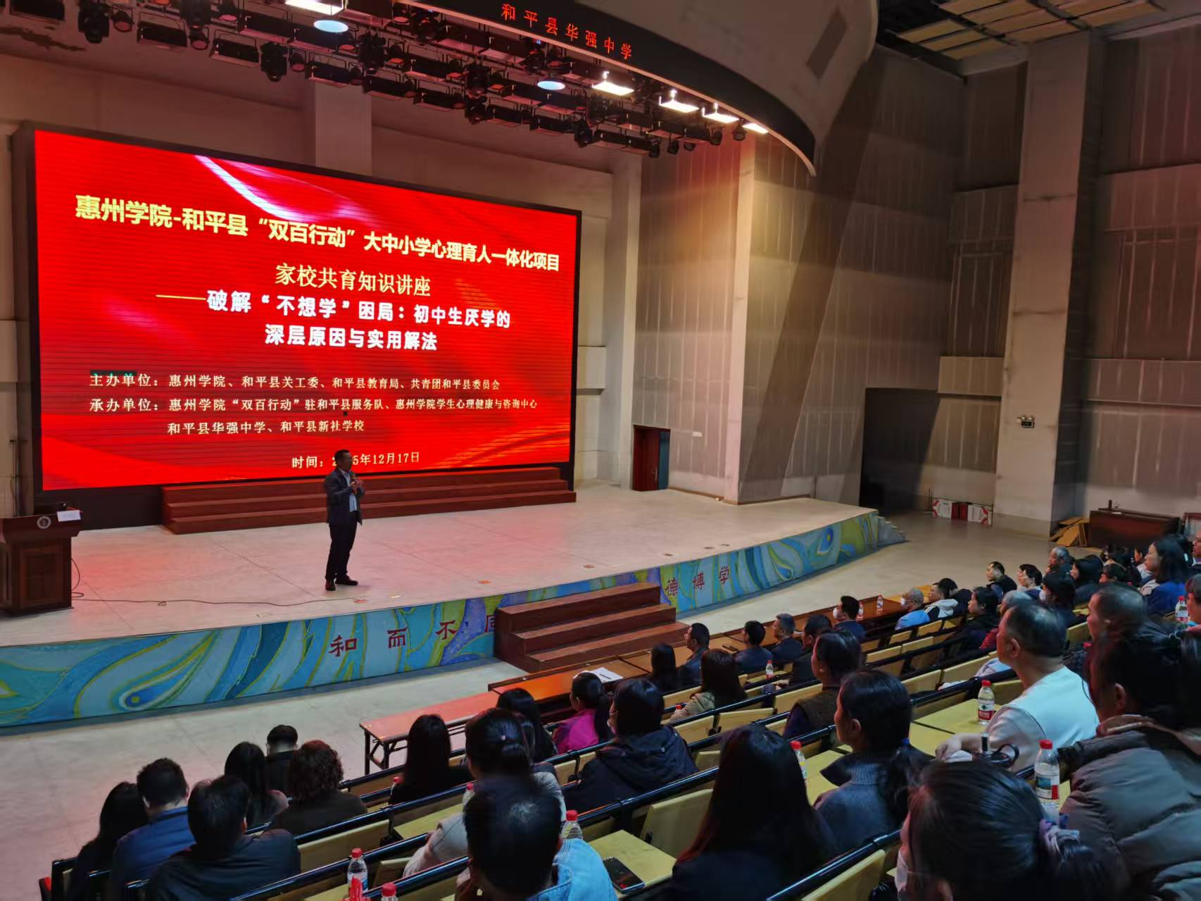 本网讯 12月17日,由我校牵头,联合和平县关工委、县教育局、团县委共同主办的“家校共育讲座暨‘双百行动’年度总结会”在和平县华强中学圆满举行。活动由我校“双百行动”驻和平县服务队、心理健康与咨询中心携手当地华强中学、新社学校承办,旨在深化校地协同育人,精准破解县域青少年心理教育难题。