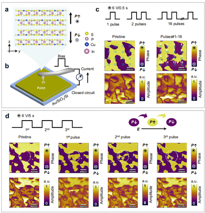 第二篇论文突破了传统双极电场调控局限,首次在范德瓦尔斯铁电材料CuInP2S6中实现单向电场下的可逆铁电畴切换,发现了显著的“形状记忆”效应和单极性电场下可编程畴结构图案化功能,为可编程铁电存储器件和低功耗类脑计算应用开辟了新路径。