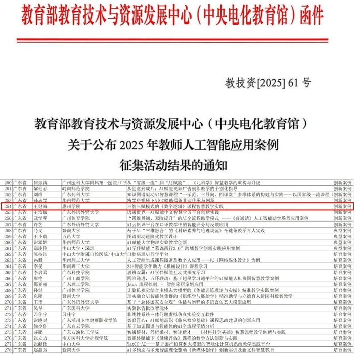 本网讯 近日,教育部教育技术与资源发展中心(中央电化教育馆)发布《关于公布2025年教师人工智能应用案例征集活动结果的通知》,我校计算机科学与工程学院王健海副教授报送的“三智三赋模式的《数字逻辑》课程智慧教学实践”案例成功入选。此次全国共征集案例4609件,高等教育教师案例仅397件,我省高校仅有29个案例最终入选。