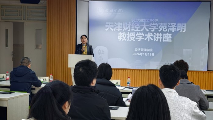 本网讯 1月13日,天津财经大学苑泽明教授应邀做客我校东江大讲堂,在旭日科技大楼B座501会议室开展题为“数智化转型背景下数据资产赋能实体经济高质量发展的若干理论问题研究”的学术讲座。本次讲座由科学技术部、宣传统战部与经济管理学院联合主办,讲座由经济管理学院副院长郭萍主持。