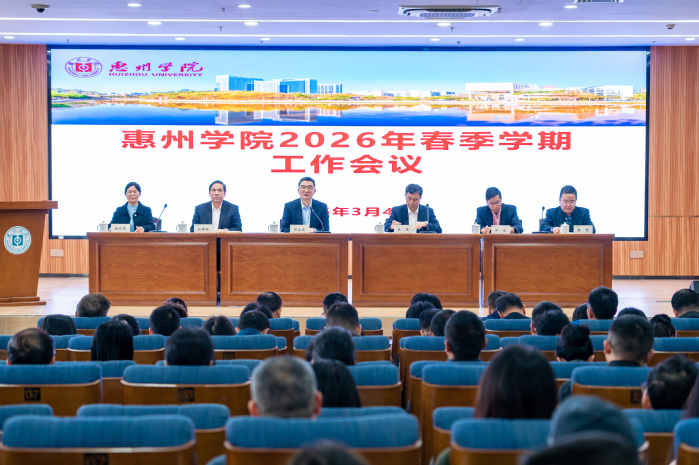 本网讯 3月4日下午,我校在旭日科技大楼A座201会议厅召开2026年春季学期工作会议。会议深入学习贯彻全国及全省教育大会精神,认真落实全省高质量发展大会和全省教育系统警示教育大会的部署要求,系统总结过往成绩,科学研判机遇挑战,全面部署新一年学校的重点工作。校党委书记彭永宏、校长王胜出席会议并讲话。副校长刘国栋、郑文、魏晓慧,校纪委书记、省监委驻惠州学院监察专员张硕,以及全体中层干部参加会议。