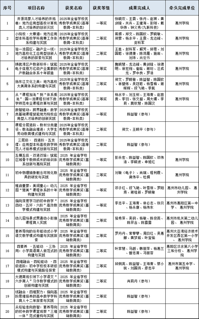 本网讯 近日,广东省教育厅公布的2025年全省学校优秀教学成果奖,我校共有14项教学成果获奖,其中,高等教育教学成果(本科类)6项,基础教育教学成果奖8项。这是我校首次获得独立主持的省级基础教育教学成果奖,且基础教育教学成果奖获奖总数在全省高校中位列第三。