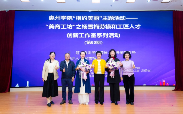 本网讯 3月6日下午,由惠州市侨联指导,惠州学院工会、宣传统战部、教务部主办,惠州学院侨联、服装学院党委与惠州城市职业学院工会(妇委会)共同承办的“相约美丽”主题活动暨“美育工坊”之杨雪梅劳模和工匠人才创新工作室系列活动第60期,在惠州城市职业学院明德书院报告厅举行。惠州学院服装学院党委书记张小琨,惠州城市职业学院党委委员、副院长吴林华,党委委员、宣传部部长冯理明,妇委会主任黄艳及该校500余名教职工参加活动。