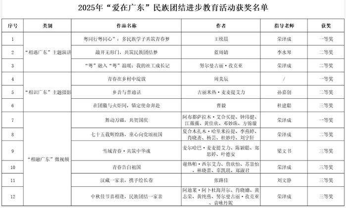 本网讯 近日,由广东省教育厅主办的2025年“爱在广东”民族团结进步教育活动评选结果正式公布。我校师生踊跃参赛、精心备赛,凭借扎实的创作功底与出色的综合表现,共斩获12项奖项。其中,在“相遇广东”主题演讲比赛中,我校荣获一等奖1项、二等奖2项;在“相识广东”主题摄影赛事中,斩获一等奖1项、二等奖1项、三等奖1项;在“相融广东”微视频创作活动中,摘得一等奖1项、二等奖1项、三等奖4项,充分彰显了我校民族团结进步教育工作的扎实成效,生动展现了全校各民族师生同心同德、昂扬向上、携手奋进的良好精神风貌。