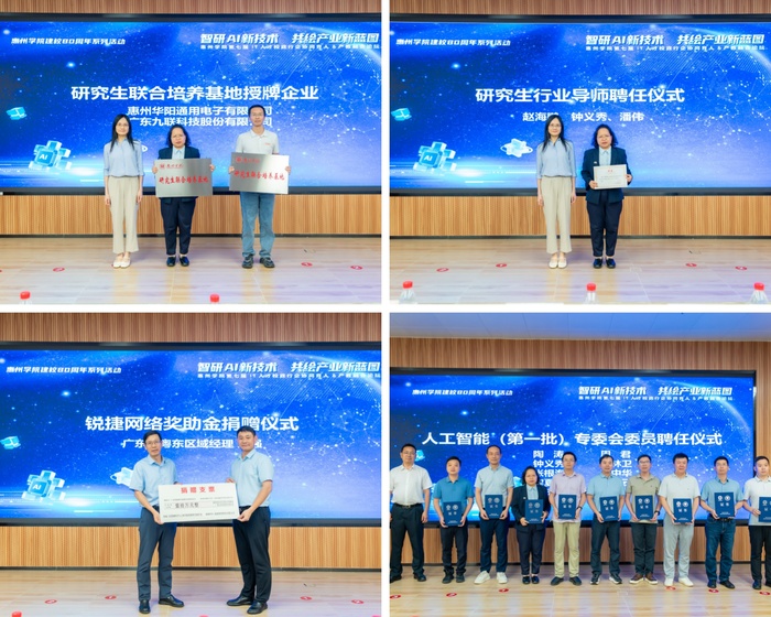 活动现场,与会领导嘉宾共同为“惠州市人工智能重点实验室”“惠州市网络安全工程技术研究中心”“开源鸿蒙智慧创客实验室”“金舟AI协同创新实验室”揭牌,并进行校外实践基地与研究生联合培养基地的授牌、研究生行业导师聘任、锐捷网络奖助金捐赠以及人工智能专委会专家聘任仪式。