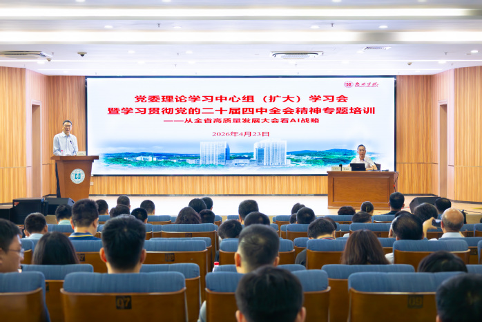 本网讯 4月22日,学校在旭日科技大楼A座201报告厅举办党委理论学习中心组(扩大)学习会暨学习贯彻党的二十届四中全会精神专题培训,深入学习贯彻党的二十届四中全会精神,聚焦人工智能赋能深化教育教学综合改革主题开展专题学习。校党委书记彭永宏主持并讲话,中共广州市委党校信息网络中心副主任、教授李韶驰应邀作专题辅导。全体校领导、中层干部、其他干部代表参加培训。
